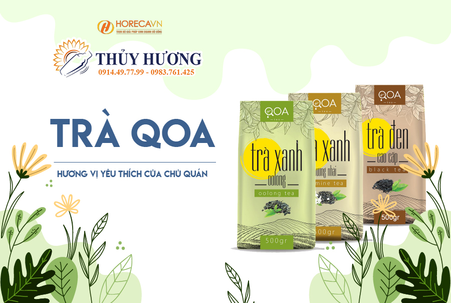 Trà QOA: thuộc phân khúc tiệm cao về chất lượng trong dòng trà trên thị trường nhưng sở hữu mức giá phù hợp với đại đa số mô hình quán, trà QOA hiện đang được nhiều khách hàng lớn của HorecaVN sử dụng cho các món trà tại quán mình. Trà QOA có hương vị thanh nhẹ, thơm mát, khi uống để lại hậu vị ngọt thanh nơi cuống họng và được chọn lọc từ những lá trà chất lượng tại vùng đất Bảo Lộc, Lâm Đồng. Trà QOA hiện đang được phân phối với 2 dòng là trà túi lọc và trà lá với 9 hương vị tất cả cho bạn lựa chọn.